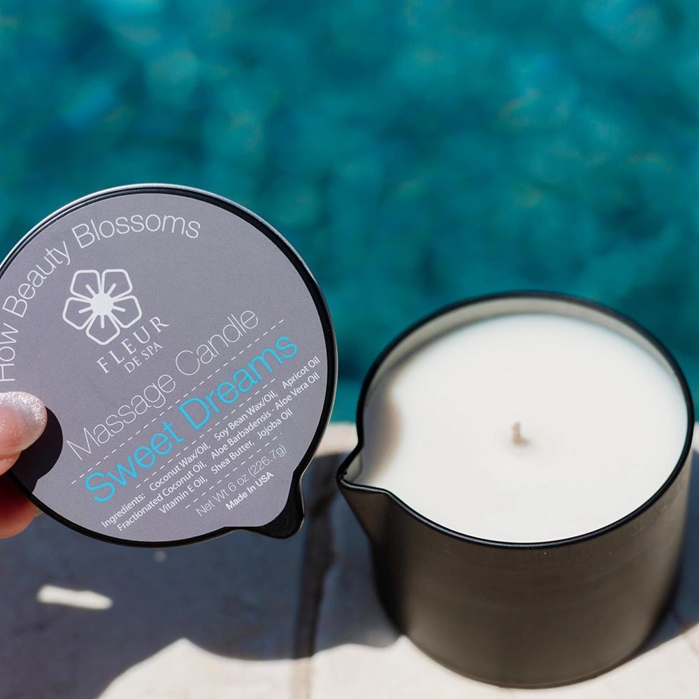 FLEUR DE SPA Massage Oil Candle – 6oz with Pour Spout – Made in USA – All Natural Coconut & Soy Blend – Melts to Warm, Alluring & Hydrating Body Oil – Perfect Spa & Gift Candle (Sweet Dreams)(Sweet Dreams)