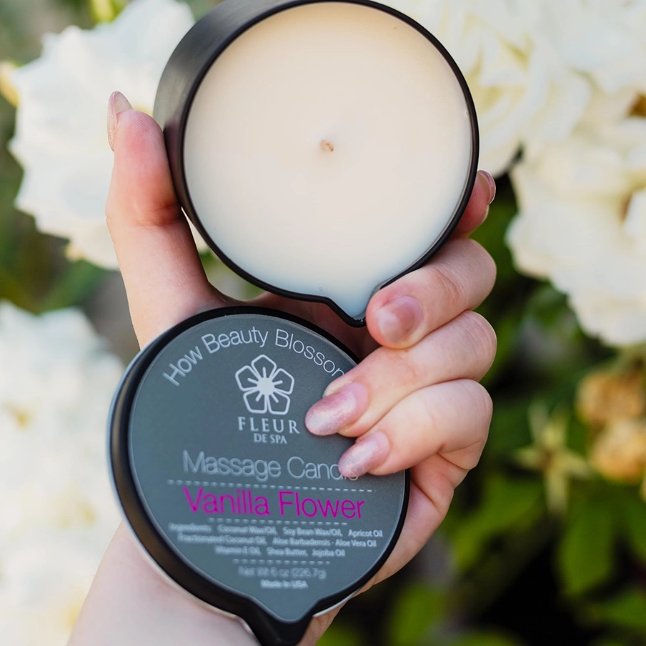 FLEUR DE SPA Massage Oil Candle – 6oz with Pour Spout – Made in USA – All Natural Coconut & Soy Blend – Melts to Warm, Alluring & Hydrating Body Oil – Perfect Spa & Gift Candle (Sweet Dreams)(Vanilla Flower)