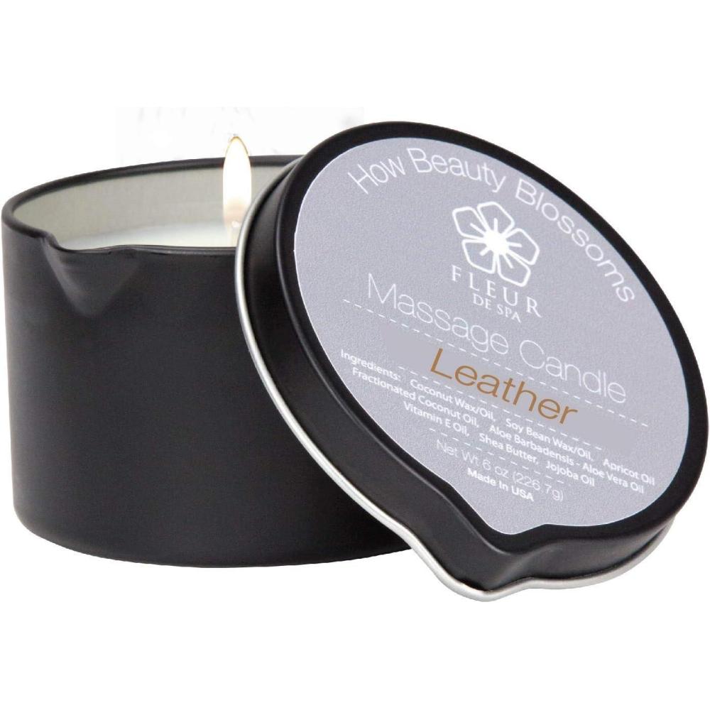 FLEUR DE SPA Massage Oil Candle – 6oz with Pour Spout – Made in USA – All Natural Coconut & Soy Blend – Melts to Warm, Alluring & Hydrating Body Oil – Perfect Spa & Gift Candle (Sweet Dreams)(Leather)